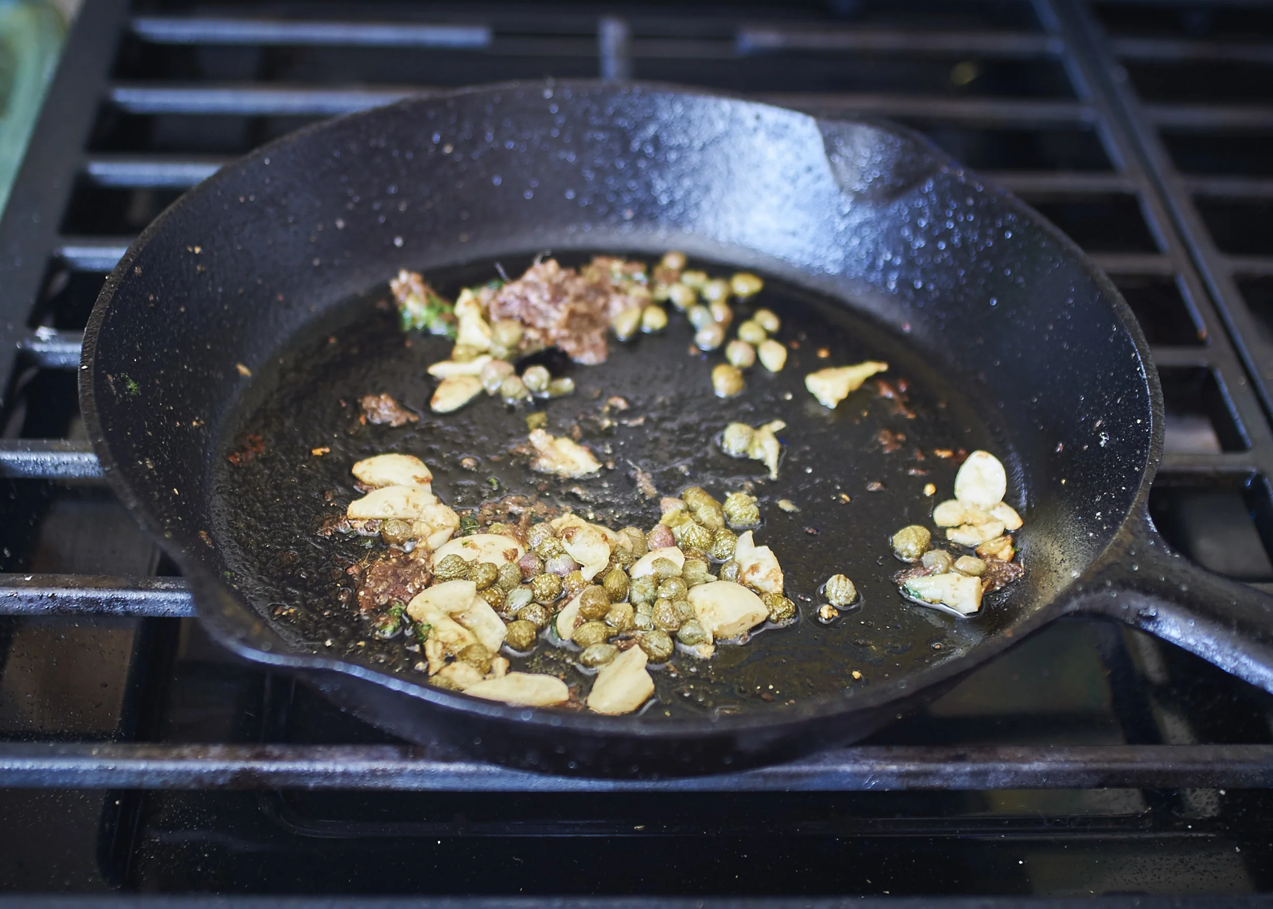 Heat oven to 350°. Season the chicken thighs with salt and pepper and let them rest while you prepare the anchovy-garlic oil. Mince one of the garlic cloves and set it aside for later. In a large, ovenproof skillet (I use cast iron) over medium-high heat, add the oil. When the oil is hot, add the 5 smashed whole garlic cloves, anchovies, and capers. Let cook, stirring with a wooden spoon to break up the anchovies, until the garlic browns around the edges and the anchovies dissolve, 3 to 5 minutes.